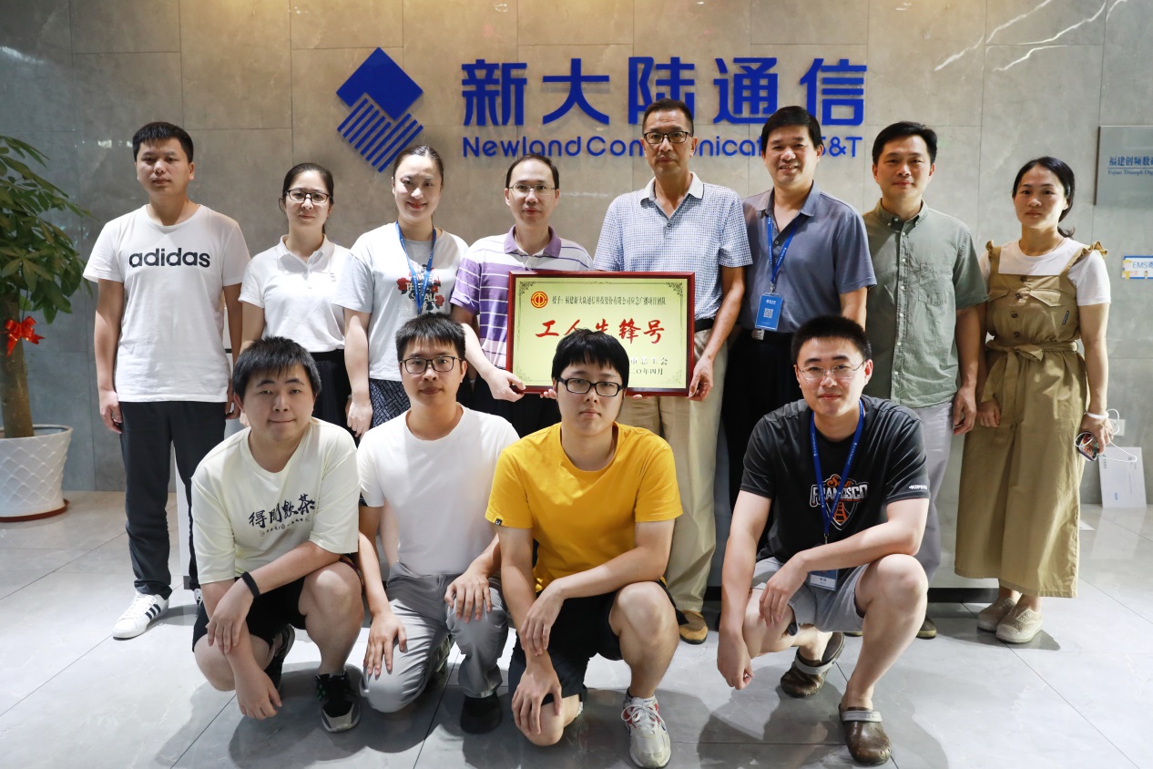 福州市高新技術(shù)產(chǎn)業(yè)工會常務(wù)副主席吳厚烽(二排左五)為新大陸應(yīng)急廣播項(xiàng)目團(tuán)隊(duì)授牌